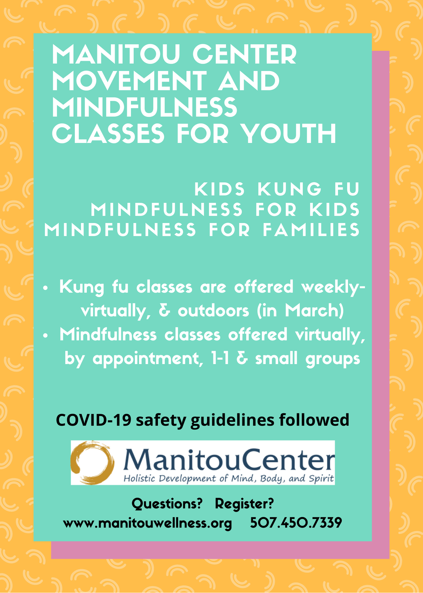 Manitou Center is offering kung fu classes outdoors and virtually, and mindfulness classes virtually. Click here for more information.
